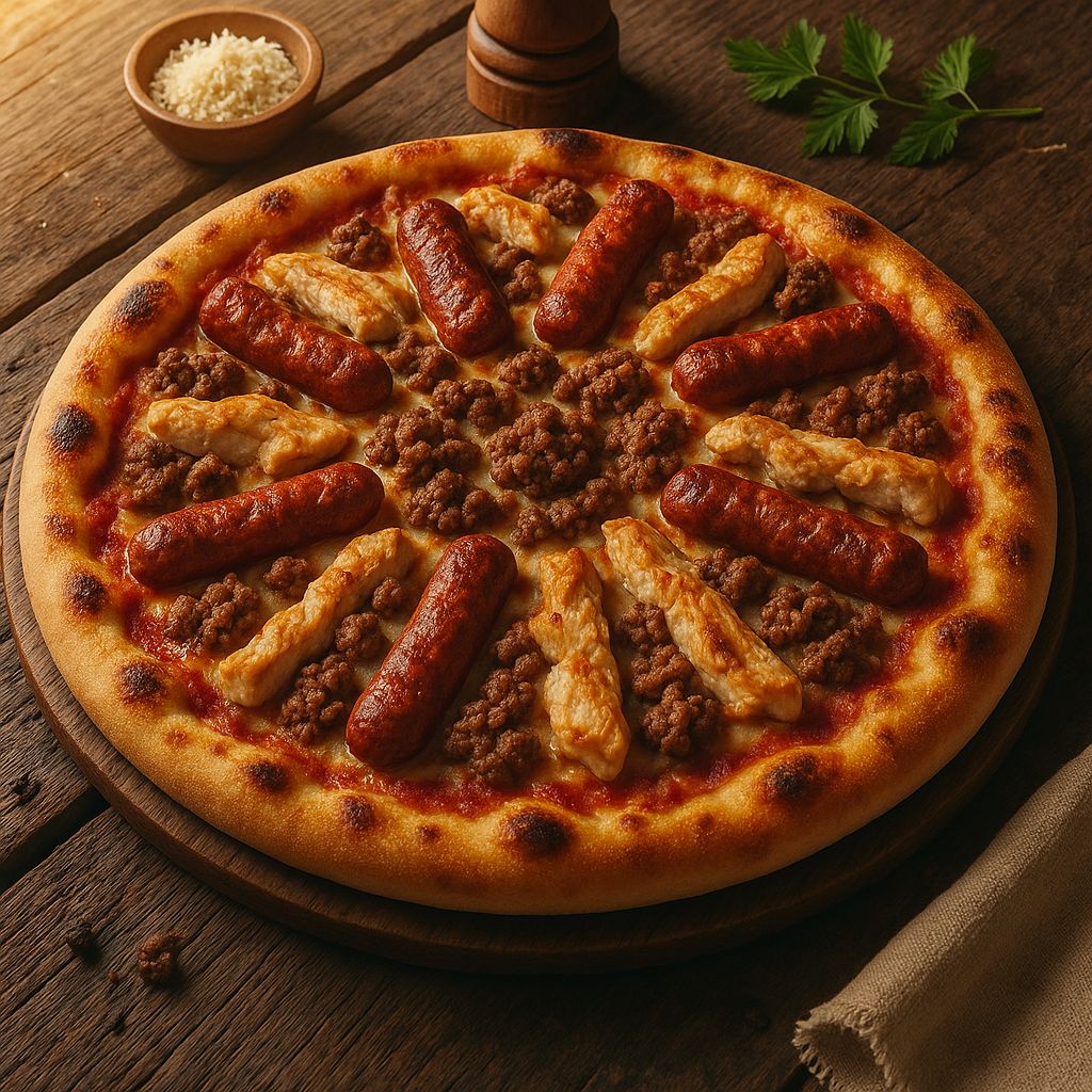 Tomate, fromage, lardons, jambon, chorizo
