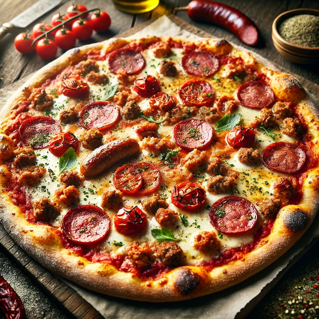 Tomate, fromage, merguez, viande hachée, poivrons